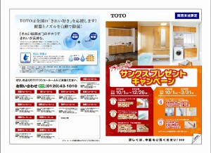 TOTO 関西支社限定でサンクスプレゼントキャンペーンが始まっています。 ☆受注期間:2014年10月1日~12月26日 1.システムキッチン「クラッソ」をご成約の場合・・・・・浄水器を無償でプレゼント! 2.サザナまた […]
