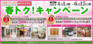 春トク!キャンペーン 期間:2016年4月1日(金)~6月15日(水) ◎ ガーデンルームご成約で3万円キャッシュバック! 期間中、LIXILリフォームネット、エクステリアマイスター店(サン工房です)にてガ […]