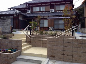 ガレージと玄関の高低差がある敷地です。 階段とスロープをつけ、歩きやすくしています。