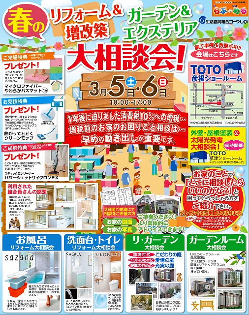 Warning: Declaration of HSM_Stylesheet::init() should be compatible with HSM_Module::init($args) in /home/nakamuragumi/nakamuragumi.ne.jp/public_html/wp-content/plugins/headspace2/modules/page/stylesheet.php on line 43 2016年3月5日6日 リフォーム&ガーデン大相談会!外壁・屋根塗装&太陽光発電大相談会!好評の内に終了いたしました。 ~滋賀のリフォーム、ガーデン、太陽光発電の株式会社サン工房~