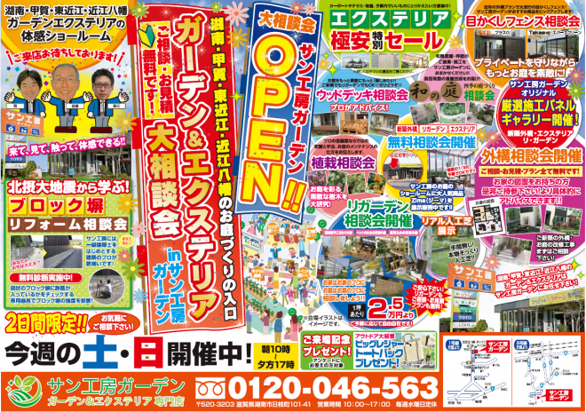 Warning: Declaration of HSM_Stylesheet::init() should be compatible with HSM_Module::init($args) in /home/nakamuragumi/nakamuragumi.ne.jp/public_html/wp-content/plugins/headspace2/modules/page/stylesheet.php on line 43 2019年2月9日(土)10日(日)ガーデン&エクステリア大相談会 大好評のうちに終了いたしました! ~滋賀のリフォーム、ガーデン、太陽光発電の株式会社サン工房~