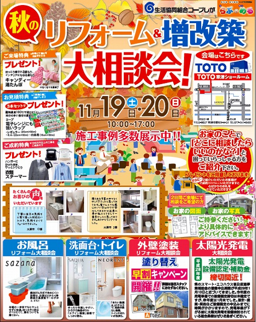 Warning: Declaration of HSM_Stylesheet::init() should be compatible with HSM_Module::init($args) in /home/nakamuragumi/nakamuragumi.ne.jp/public_html/wp-content/plugins/headspace2/modules/page/stylesheet.php on line 43 2016年11月19日(土)20日(日) リフォーム&増改築大相談会 好評の内に終了いたしました! ~滋賀のリフォーム、ガーデン、太陽光発電の株式会社サン工房~
