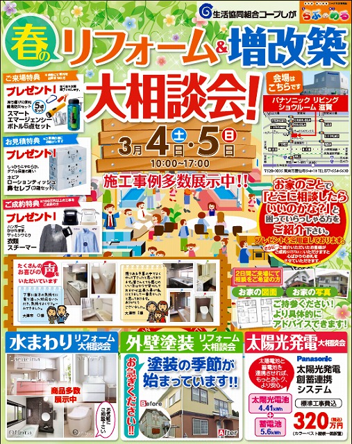 Warning: Declaration of HSM_Stylesheet::init() should be compatible with HSM_Module::init($args) in /home/nakamuragumi/nakamuragumi.ne.jp/public_html/wp-content/plugins/headspace2/modules/page/stylesheet.php on line 43 2017年3月4日(土)5日(日)春のリフォーム&増改築大相談会、好評の内に終了いたしました。 ~滋賀のリフォーム、ガーデン、太陽光発電の株式会社サン工房~