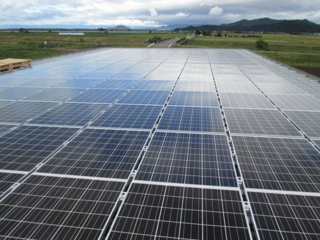 滋賀県近江八幡市で自社グループ会社のびわこ電力株式会社が重ね式88折板屋根の上に設置している工事事例です。パネルはKYOCERA ECONOROOTS KJ195P-3CJ2CE 191枚を農業倉庫の屋根をお借りして設置させていただいております。パネルの出力は37.245kWになります。再生可能エネルギーの固定価格買取制度を利用しまして、関西電力に20年間同じ単価で売電することができます。