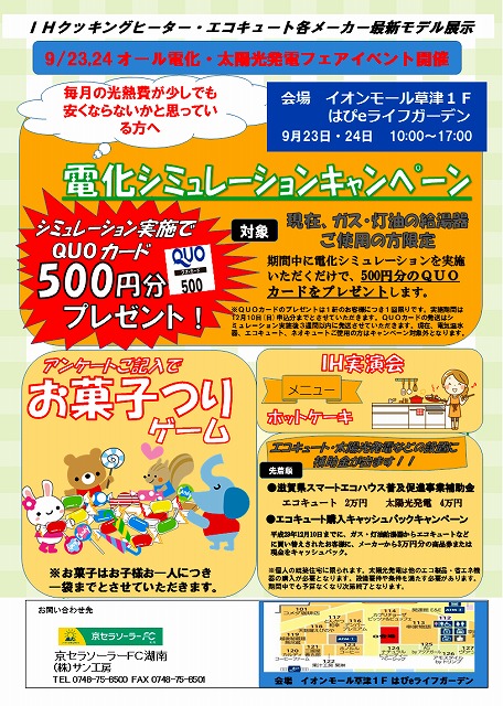 2017年9月23日(土)24日(日)イオンモール草津にて オール電化・太陽光発電フェア 開催しました!! ~滋賀のリフォーム、ガーデン、太陽光発電の株式会社サン工房~