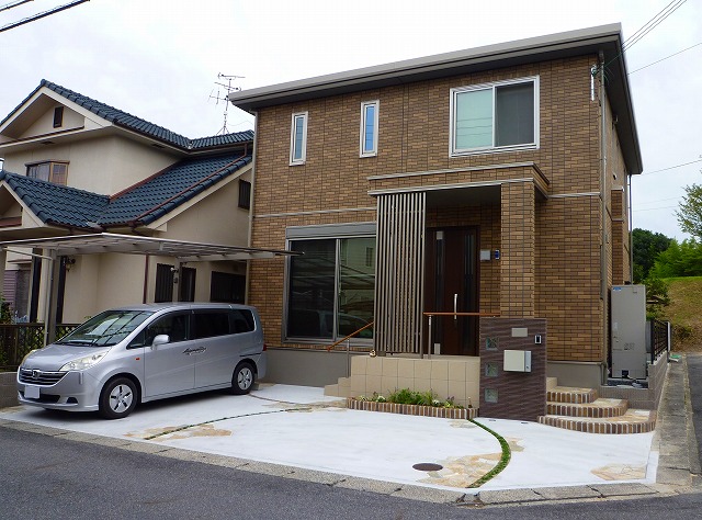 重々しい外観に動きを添える外構 色合いは建物と同系色で、階段などカタチを丸くすることで全体的に趣が出ました。 ガレージは車がないときでも殺風景にならないよう、コンクリートに石を貼り付けました。 見切はレンガとタマリュウです。