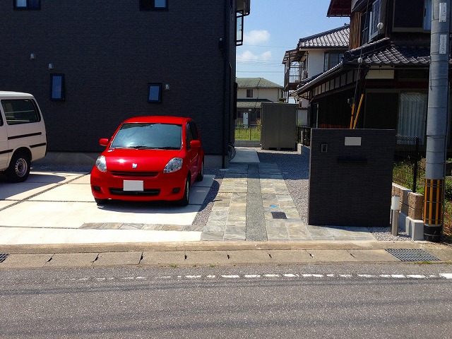 階段とスロープで高低差を解消した外構