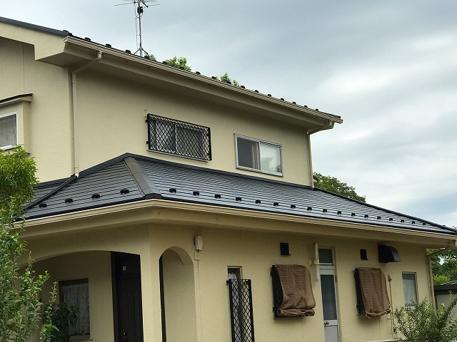 外壁は日本ペイント、水性シリコンセラ。屋根材はニチハの横暖ルーフSです。横暖ルーフSはニチハ独自の技術により遮熱鋼板(塗装高耐食GLめっき鋼板)と断熱材(硬質ウレタンフォーム)を一体成型した高機能「金属製屋根材」で、軽量で地震に強く、一年を通して優れた断熱性能を発揮し、超高耐久で沿岸部でも安心してご使用いただけます。